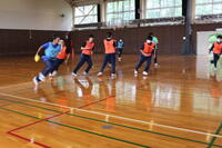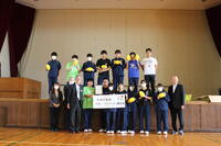 贈呈式は2学年の 「生涯スポーツA」の授業で行われ、代表生徒が目録を受け取ったあと、早速ゲームを実施しました。