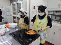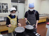 事後学習では調理工程を振り返り、混ぜ方や加熱温度の課題点を話し合いました。また、たんぱく質の凝固反応は化学の授業と繋がりがあります。教科を横断して、食品の特性や調理操作の大切さ等、さらに理解を深めていきましょう!