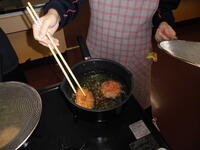 実習では、成形方法や衣付け、油の温度など、コロッケが破裂しないためのポイントを確認しながら作業を進めました。また、揚げ油は牛乳パックと新聞紙を使って環境に配慮した片付けの方法を体験し、家庭で役立つ片付けの工夫についても学びました。